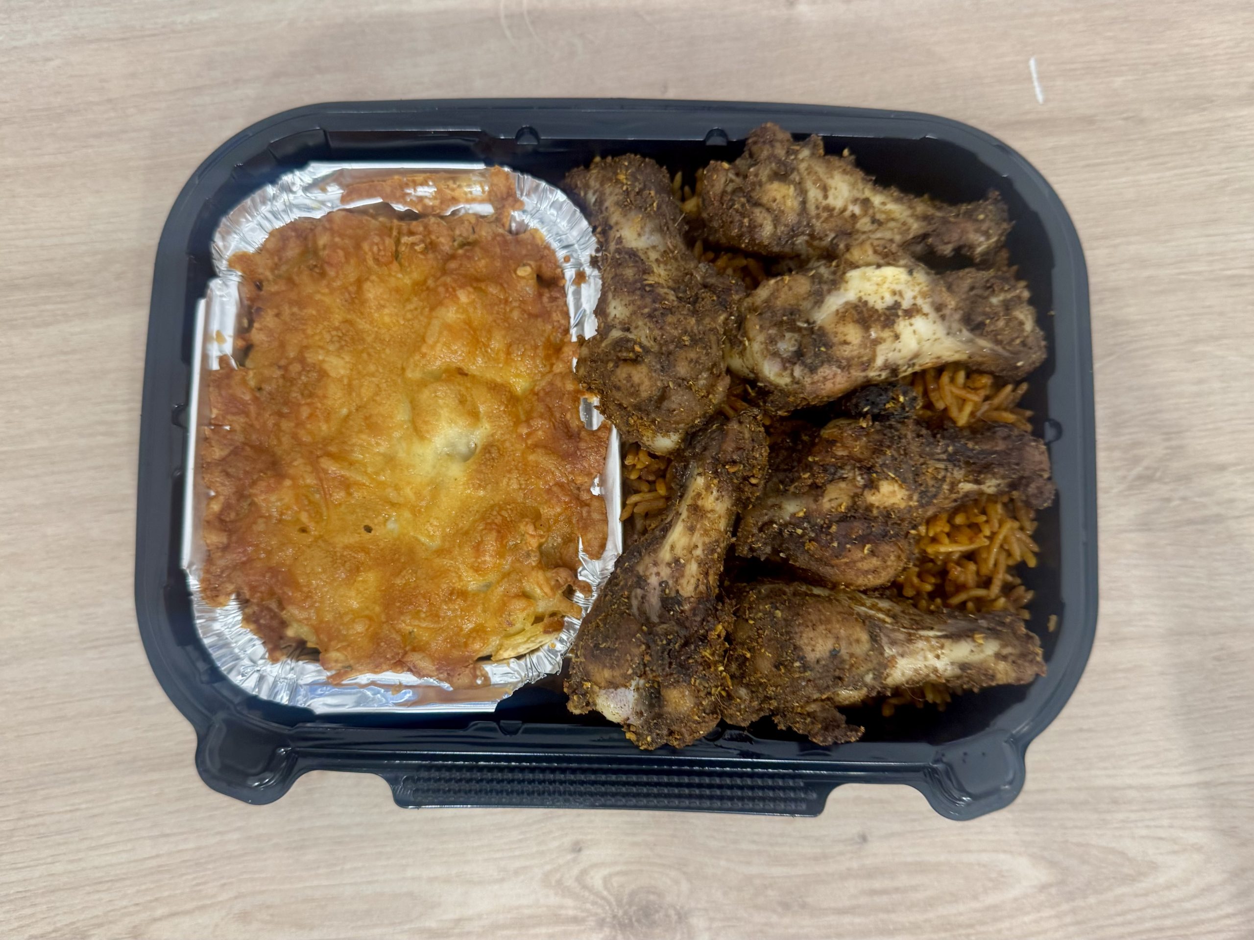 Our Loaded Mac & Rice Box is pure comfort — creamy mac & cheese paired with rich smoky jollof rice, topped with one halal surf or turf of your choice.