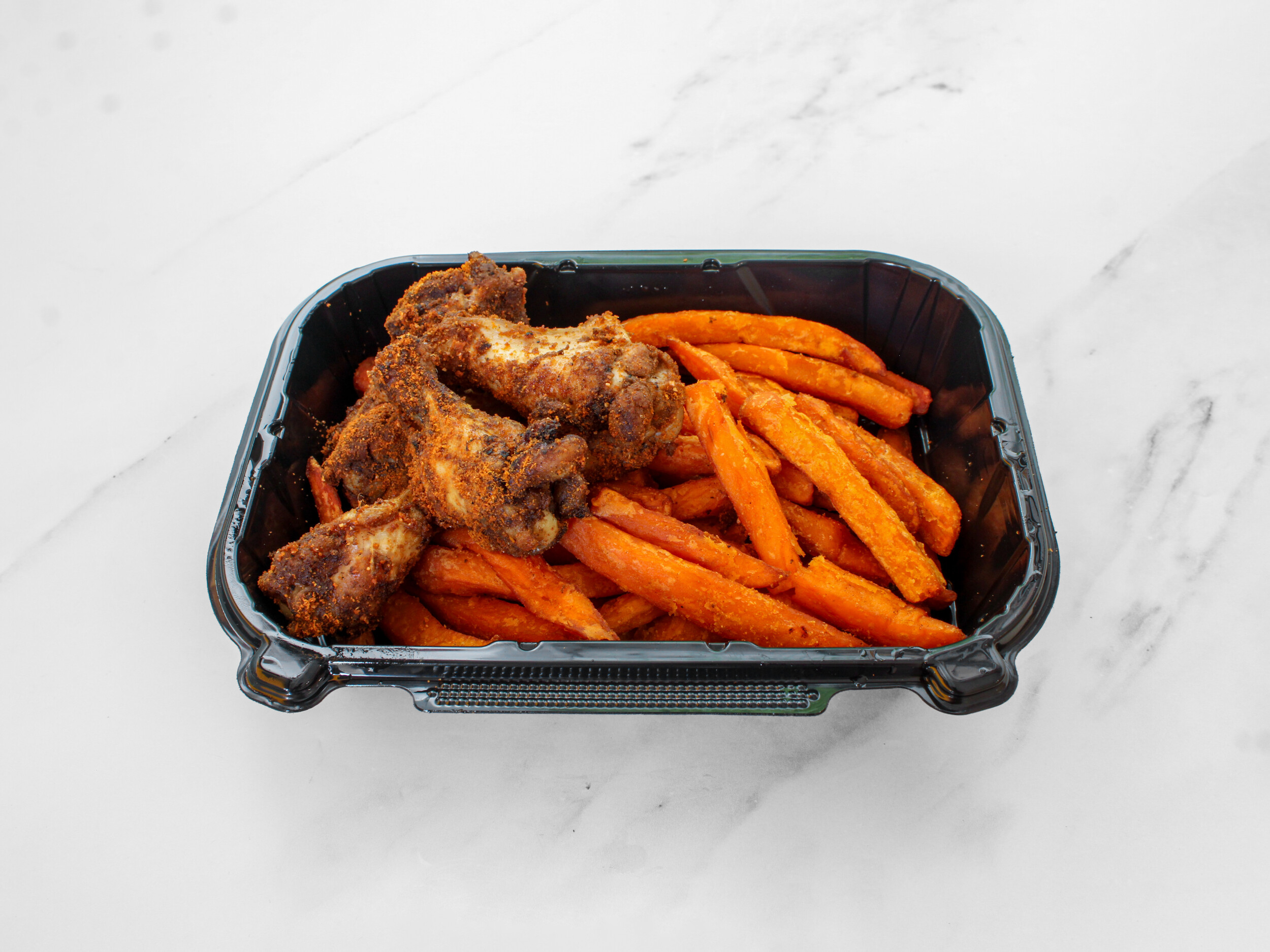Crispy sweet potato fries take centre stage in this bold and satisfying box, loaded with your choice of halal surf or turf—from salt & pepper calamari to suya or jerk BBQ wings. Every bite delivers that perfect balance of sweet and smoky flavours. A loaded fries experience, done the BGirls way.