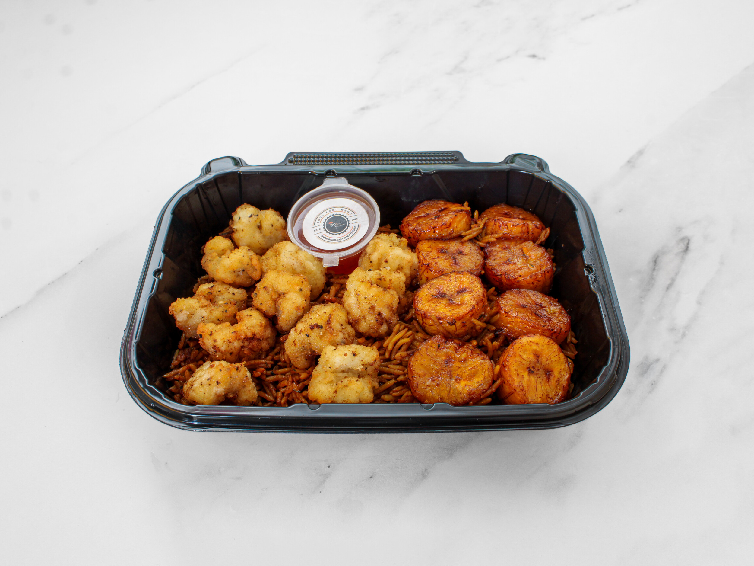 Smoky jollof rice, loaded with sweet fried plantain, and your choice of halal surf or turf—flavour-packed from the first bite to the last.